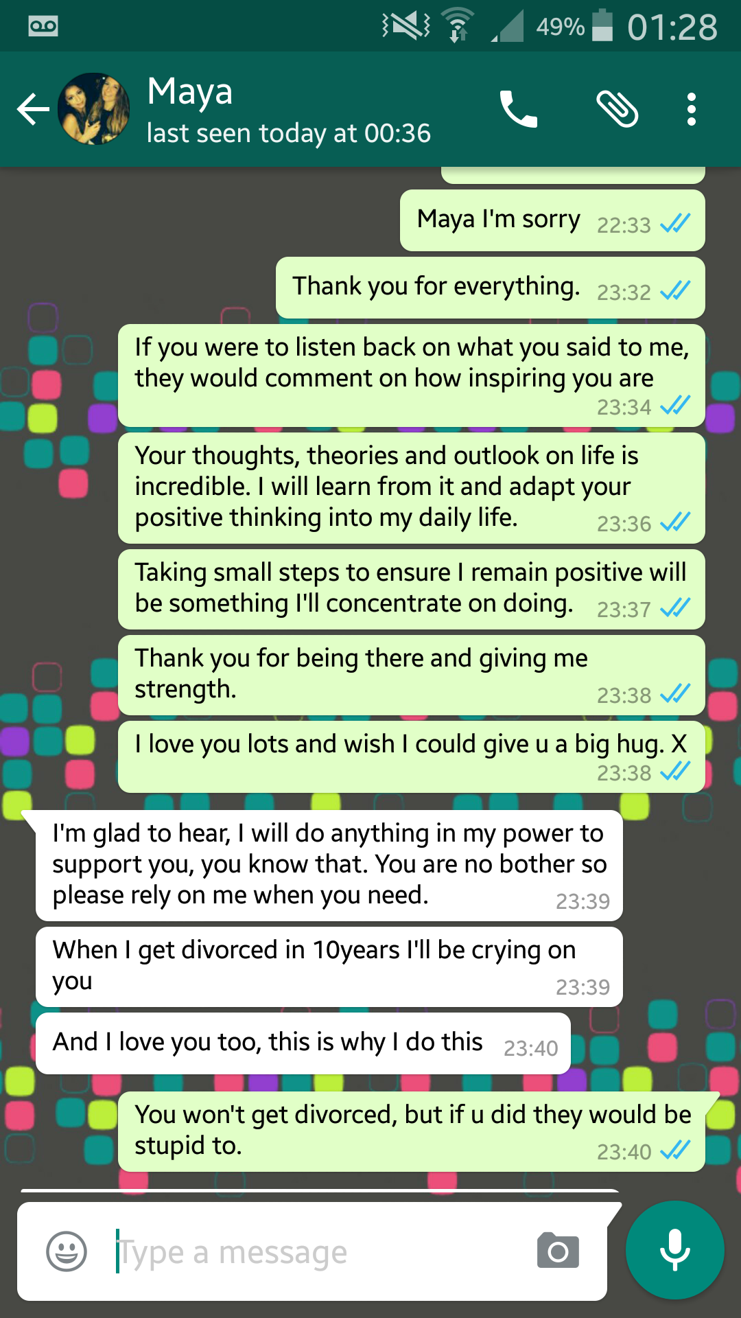 Screenshot of chat after my sister phoned me when I was in floods of tears.